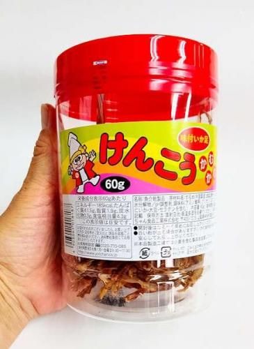 「けんこうカムカム60g(小ポット)」 イカげそを唐辛子で堅〜く焼き上げました。 噛みごたえ充分、あごも鍛えられるけんこうカムカム。 お求めやすいミニポットの登場です! 1ポット:60g入り 駄菓子屋さんで売っていた懐かしい駄菓子「いか・梅・珍味類」を紹介いたします。 充実のアイテム数と豊富な在庫。おいしいなつかしさでいっぱい! お求め安い卸価格で通販いたします。