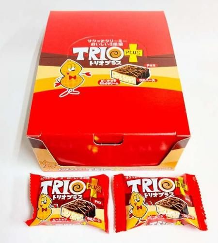 やおきん「トリオプラス」 サクッとクリーミーなおいしいチョコレート。 「チョコ」と「ウエハース」「ピーナッツミルククリーム」の3重層! 駄菓子屋さんで売っていた懐かしい駄菓子「チョコ&チョコスナック」を紹介いたします。 充実のアイテム数と豊富な在庫。おいしいなつかしさでいっぱい! お求め安い卸価格で販売いたします。