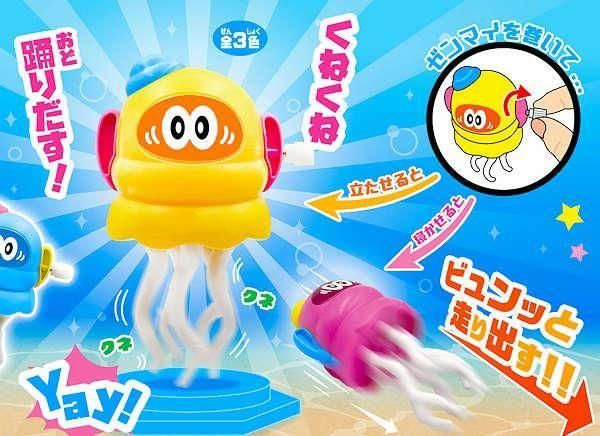 「くねくねイカダンサー」 ゼンマイを巻いて立たせるとクネクネ踊りだす。 タイヤを下にして置くと走り出す!面白玩具です。 本体サイズ:約10cm 色:3色アソート(指定不可)。 サンプル動画:https://www.youtube.com/watch?v=yM7c6X4w9og