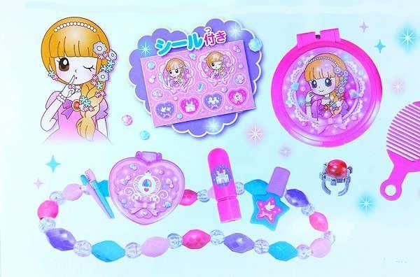 内容:カギ、アイシャドウ、くし、ボトル、口紅、コンパクト、キラキラシール、ネックレス、指輪